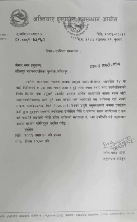 काठमाडौँ । अख्तियार दुरुपयोग अनुसन्धान आयोगले ललितपुर महानगरपालिकाका मेयर चिरिबाबु महर्जनलाई पत्र काटेको छ ।