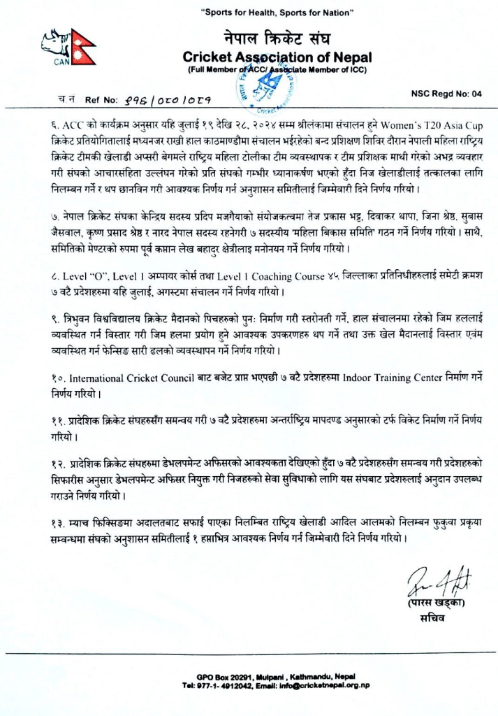 काठमाडौँ । नेपाल क्रिकेट संघ (क्यान) को केन्द्रीय कार्यसमितिको बैठकले गरेका निर्णय सार्वजनिक गरिएको छ ।