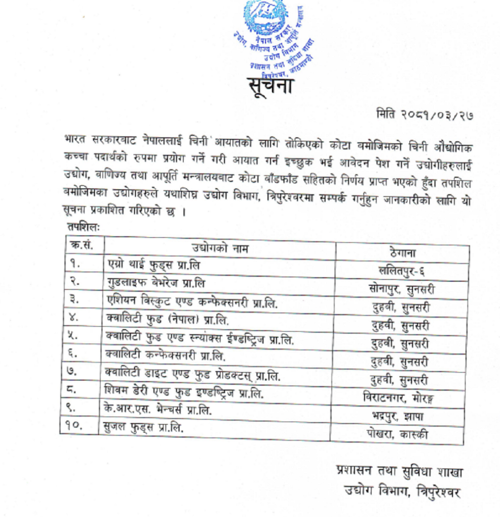 भारत सरकारबाट नेपाललाई चिनी आयातको लागि तोकिएको कोटा बमोजिम औद्योगिक कच्चा पदार्थको रुपमा आयात गर्न विभागमा दिएको आवेदन अनुसार १० वटा उद्योगले अनुमति पाएको उद्योग विभागले जनाएको छ ।
