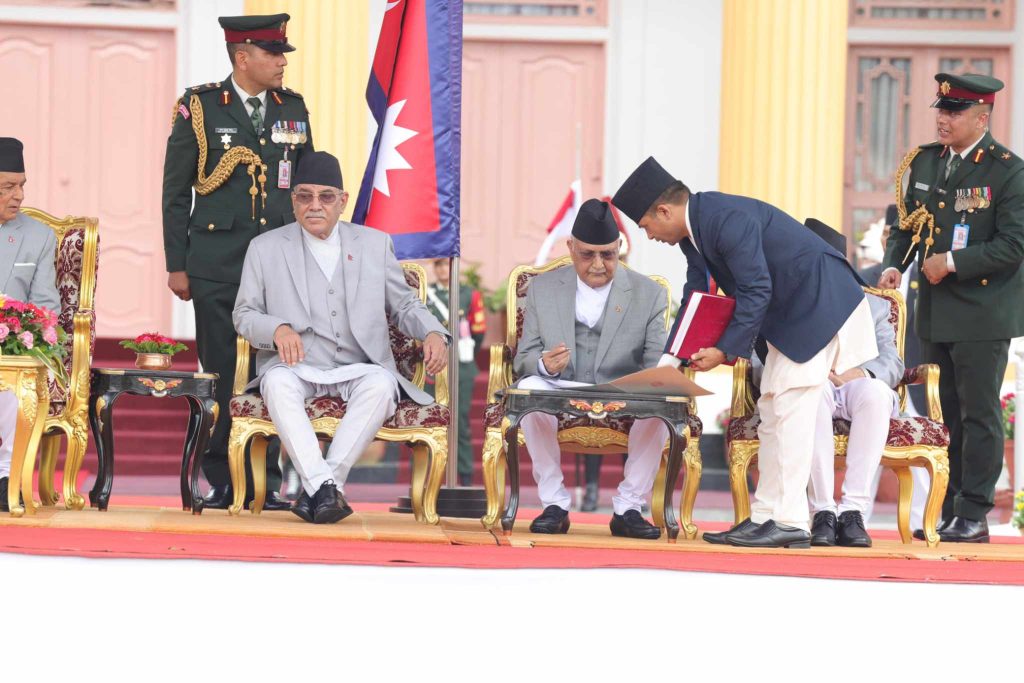 ओलीसँगै नवनियुक्त मन्त्रीहरुलाई पनि शपथ खुवाइयो ।