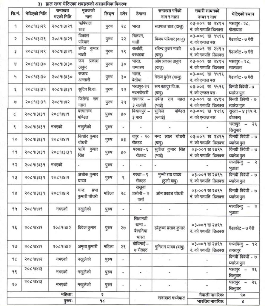 जसमा १८ पुरुष र २ महिला रहेका छन् । अहिलेसम्म १४ जनाको सनाखत भएकोमा ४ जना भारतीय नागरिक रहेको जिल्ला प्रशासन कार्यालय चितवनले जानकारी दिएको छ ।