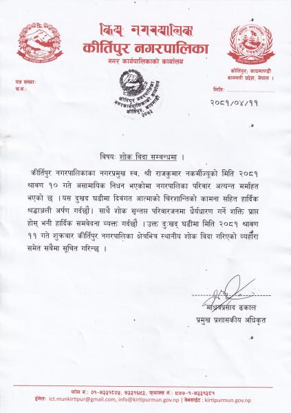 मेयर नकर्मीको पार्थिव शरीर श्रद्धाञ्जलीका लागि ९ बजेदेखि ११ बजेसम्म कीर्तिपुर नगरपालिका परिसरमा राखिने छ । नकर्मीको निधनमा आज नगरपालिकाभर शोक बिदा दिइएको छ। उनको आजै अन्त्येष्टि गरिने छ।