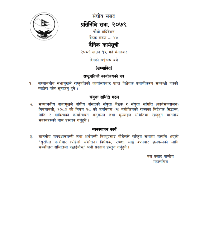 यस्तै, उपप्रधानमन्त्री तथा अर्थमन्त्री विष्णुप्रसाद पौडेलले राष्ट्रियसभामा उत्पत्ति भएको सुरक्षित कारोबार (पहिलो संशोधन) विधेयक, २०८१ लाई दफावार छलफलका लागि सम्बन्धित समितिमा पठाउन प्रस्ताव प्रस्तुत गर्ने सम्भावित कार्यसूचीमा उल्लेख छ ।