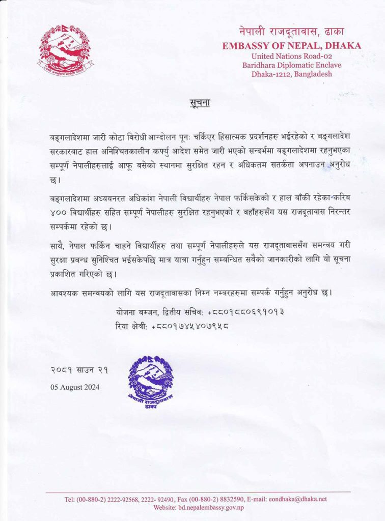 बंगलादेशमा रहेका नेपाली विद्यार्थीलाई सुरक्षित रहन दूतावासको आग्रह