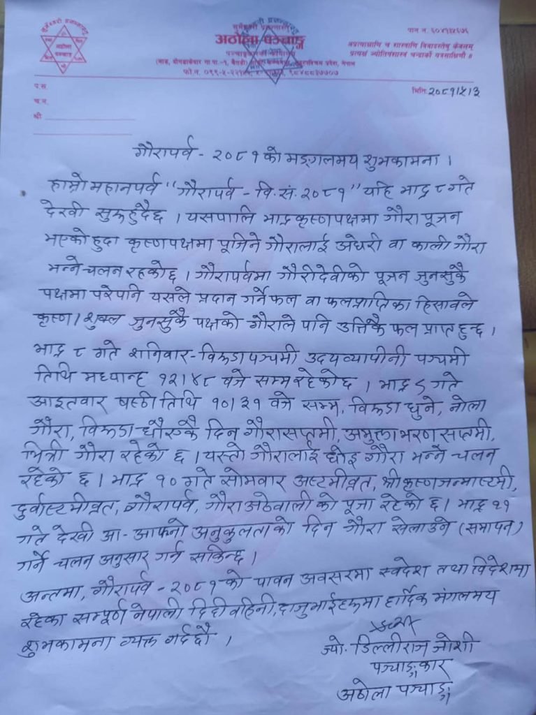 अठोला पञ्चाङ्गका पञ्चाङ्गकार डिल्लीराज जोशीद्वारा हस्ताक्षरित विज्ञप्तिमा यसपाली गौरा पुजन भाद्र कृष्णपक्षमा रहेको जनाइएको छ । विज्ञप्तिमा भनिएको छ, ‘कृष्ण पक्षमा पुजिने गौरालाई अँधेरी वा काली गौरा भनिन्छ ।’