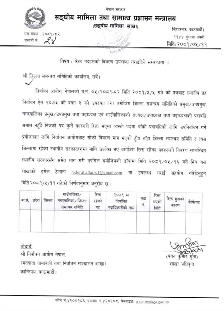 जिल्ला समन्वय समिति प्रमुख, उपप्रमुख, नगरपालिका प्रमुख, उपप्रमुख तथा वडाध्यक्ष एवं गाउँपालिका अध्यक्ष, उपाध्यक्ष तथा वडाध्यक्षको पदावधि समाप्त नहुँदै निजको पद कुनै कारणले रिक्त भएमा त्यस्तो पदमा बाँकी पदावधिका लागि उपनिर्वाचन गर्ने प्रयोजनका लागि निर्वाचन आयोगबाट सोको विवरण माग भएको भन्दै मन्त्रालयले यस्तो परिपत्र गरेको हो ।