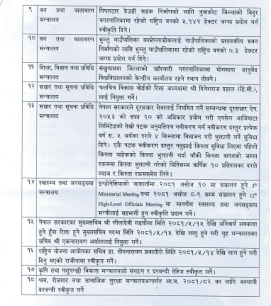 मन्त्रिपरिषदको बैठकका निर्णयहरु: