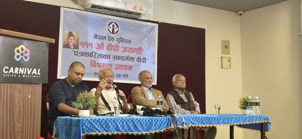 काठमाडौँ । प्रथम जननिर्वाचित प्रधानमन्त्री बिपी कोइरालाको एक सय ११औँ जन्मजयन्तीका अवसरमा आज नेपाल प्रेस युनियन केन्द्रीय समितिले ‘पत्रकारिताका सन्दर्भमा बिपी’ विषयक कार्यक्रम आयोजना गर्यो ।
