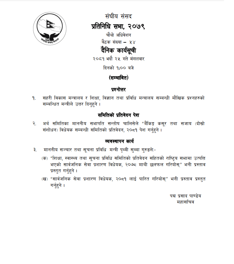 यस्तैगरी, सञ्चार तथा सूचना प्रविधि मन्त्री पृथ्वी सुब्बा गुरुङले शिक्षा, स्वास्थ्य तथा सूचना प्रविधि समितिको प्रतिवेदनसहितको राष्ट्रिय सभामा उत्पत्ति भएको सार्वजनिक सेवा प्रसारण विधेयक, २०७८ छलफलका लागि प्रस्ताव गर्ने कार्यसूची छ ।
