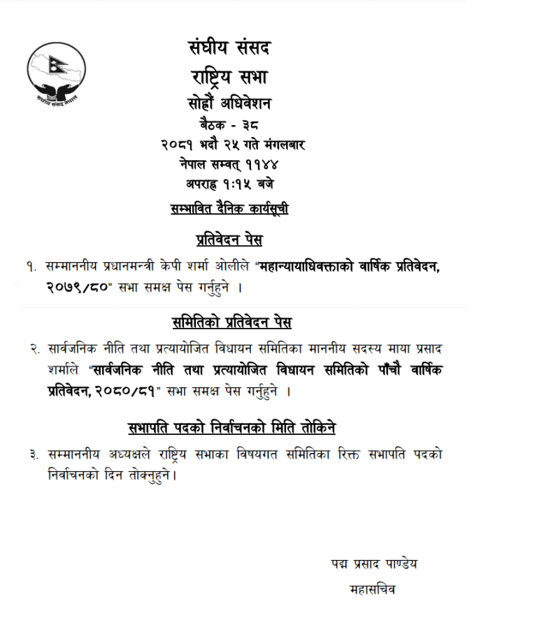 यस्तैगरी, राष्ट्रिय सभा अध्यक्ष नारायण प्रसाद दाहालले विषयगत समितिका रिक्त सभापति पदको निर्वाचनको दिन तोक्ने कार्यसूची रहेको संसद् सचिवालयले जनाएको छ ।