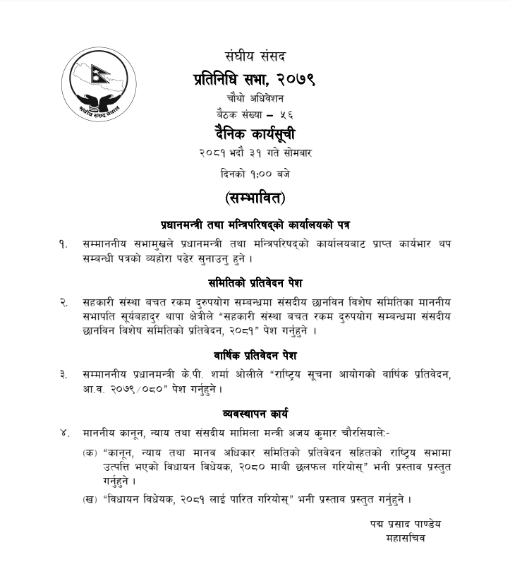 प्रतिनिधि सभाको बैठक आज बस्दै, यस्तो छ कार्यसूची