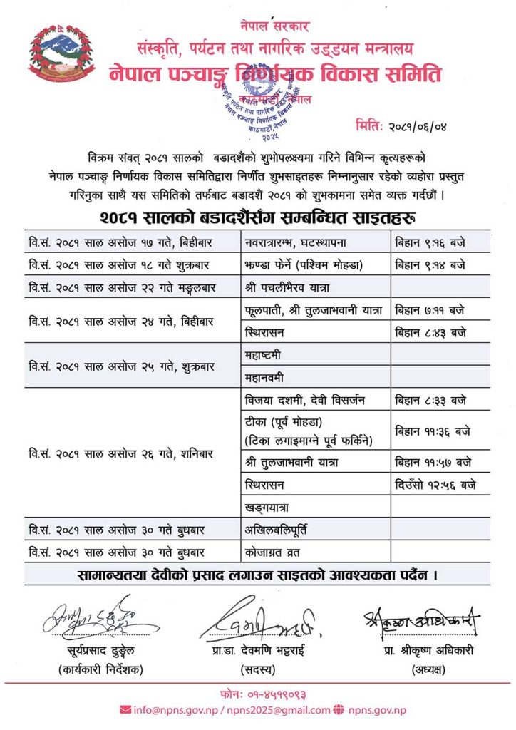 त्यसैगरी असोज २५ गते शुक्रवार अष्टमी र नवमी एकै दिन परेको समितिले जानकारी दिएको छ ।