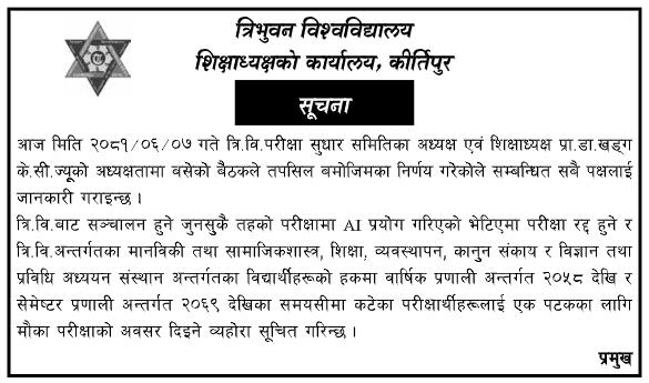 त्रिवि परीक्षा सुधार समितिका अध्यक्ष एवम् शिक्षाध्यक्ष प्राध्यापक डा. खड्ग केसीको अध्यक्षतामा सोमबार बसेको बैठकले सो निर्णय गरे बमोजिम सूचना प्रकाशित गरिएको त्रिवि शिक्षाध्यक्षको कार्यालयले जनाएको छ।