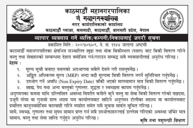 महानगरले आज एक सूचना जारी गर्दै मूल्य सूची बनाएर पसलको अग्र भागमा सबैले देख्ने गरी राख्न, अधिकतम मूल्यभन्दा बढी मूल्यमा बिक्री वितरण नगर्ने सुनिश्चित गर्न र म्याद गुज्रिएका बस्तु विक्री वितरण नगर्न भनेको छ ।