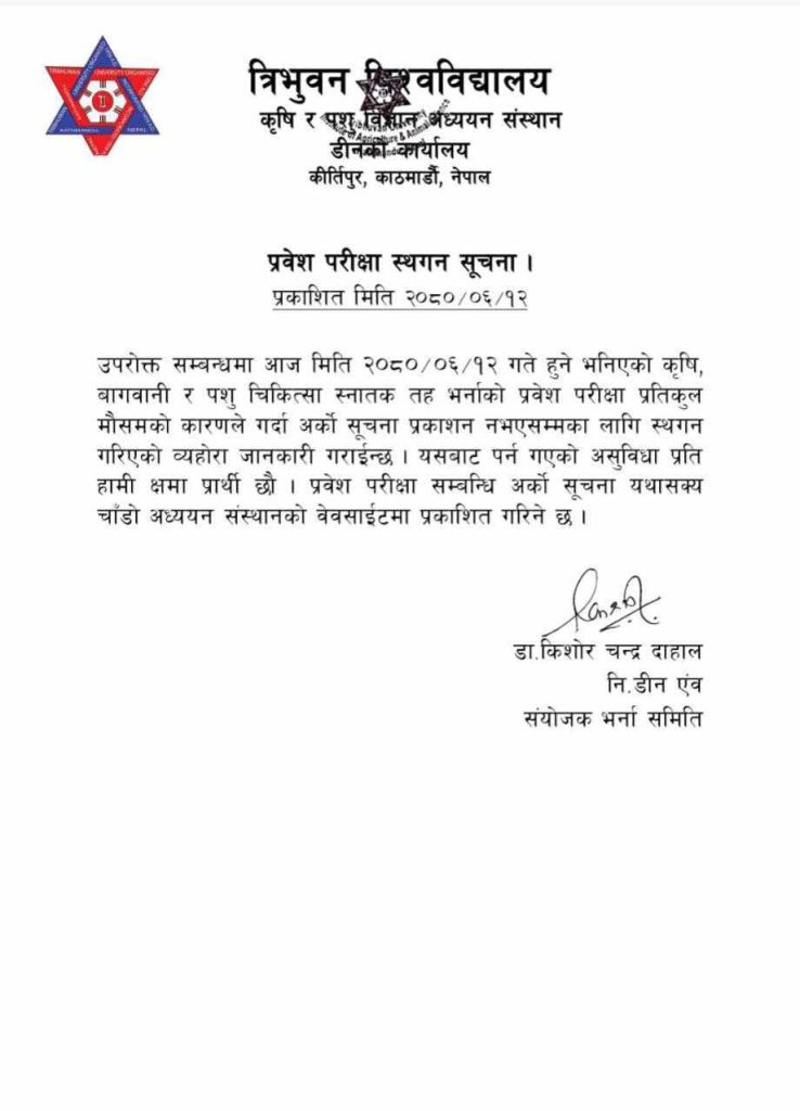 काठमाडौँ । त्रिभुवन विश्वविद्यालय कृषि र पशु विज्ञान अध्ययन संस्थानले स्नातक तहको प्रवेश परीक्षा स्थगित गरेको छ।