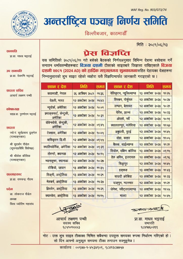 समितिका अनुसार, भारतको देहली (दिल्ली)मा सन् २०२४ अक्टोबर १२ को बिहान ११:४२ बजे दसैँ टीकाको शुभसाइत रहेको छ । अमेरिकाको न्युयोकमा २०२४ अक्टोबर १२ को बिहान १०:०१ मा शुभसाइत रहेको छ । अस्ट्रेलियाको सिड्नीमा २०२४ अक्टोबर १३ को बिहान ११:२१ बजे शुभसाइत रहेको छ । जापानको टोकियोमा २०२४ अक्टोबर १३ को बिहान ११:३५ बजे दसैँ टीकाको शुभसाइत रहेको समितिले जनाएको छ ।