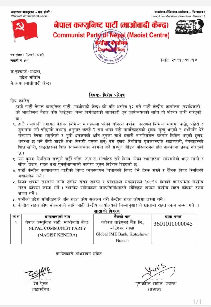 त्यस्तै पार्टीका प्रदेश समितिहरुले पनि राहत रकम संकलन गरी केन्द्रीय राहतकोषमा रकम जम्मा गर्ने व्यवस्था मिलाइएको माओवादी केन्द्रको केन्द्रीय कार्यालयले जनाएको छ ।