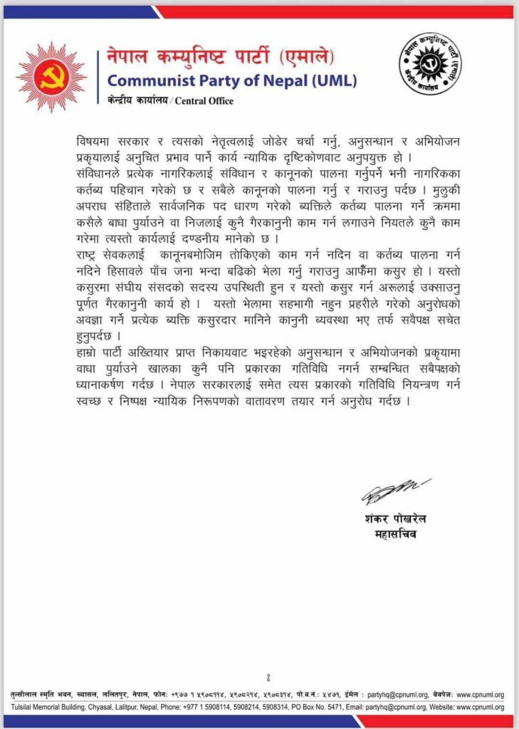 एमालेका महासचिव शंकर पोखरेलले बिहीबार विज्ञप्तिमार्फत छानबिनको प्रक्रियालाई प्रभावित पार्ने गरी भ्रम सिर्जना गरिएको बताएका छन् । “संसदीय छानबिन समितिले सर्वसम्मत रूपमा औँल्याएको विषयमा छानबिनको प्रक्रिया अघि बढिरहेको अवस्थामा सम्माननीय प्रधानमन्त्री र नेपाल सरकारका जिम्मेवार व्यक्ति र निकायका विरुद्धमा जिम्मेवार व्यक्तिहरूबाटै अमर्यादित अभिव्यक्ति दिने, गालीगलौच गर्ने र गलत आक्षेप लगाउँदै छानबिनको प्रक्रियालाई प्रभावित गर्ने गरी भ्रम सिर्जना गर्ने र अस्वस्थ वातावरण सिर्जना गर्ने काम हुनु अत्यन्त दुःखद विषय हो,” विज्ञप्तिमा भनिएको छ, “फौजदारी मुद्दाको अनुसन्धान, अभियोजन र प्रतिरक्षालाई स्वतन्त्र, भयरहित र वैज्ञानिक बनाई फौजदारी न्याय प्रणालीको प्रभावकारिता बनाउनु सबैको साझा दायित्वको हो ।”