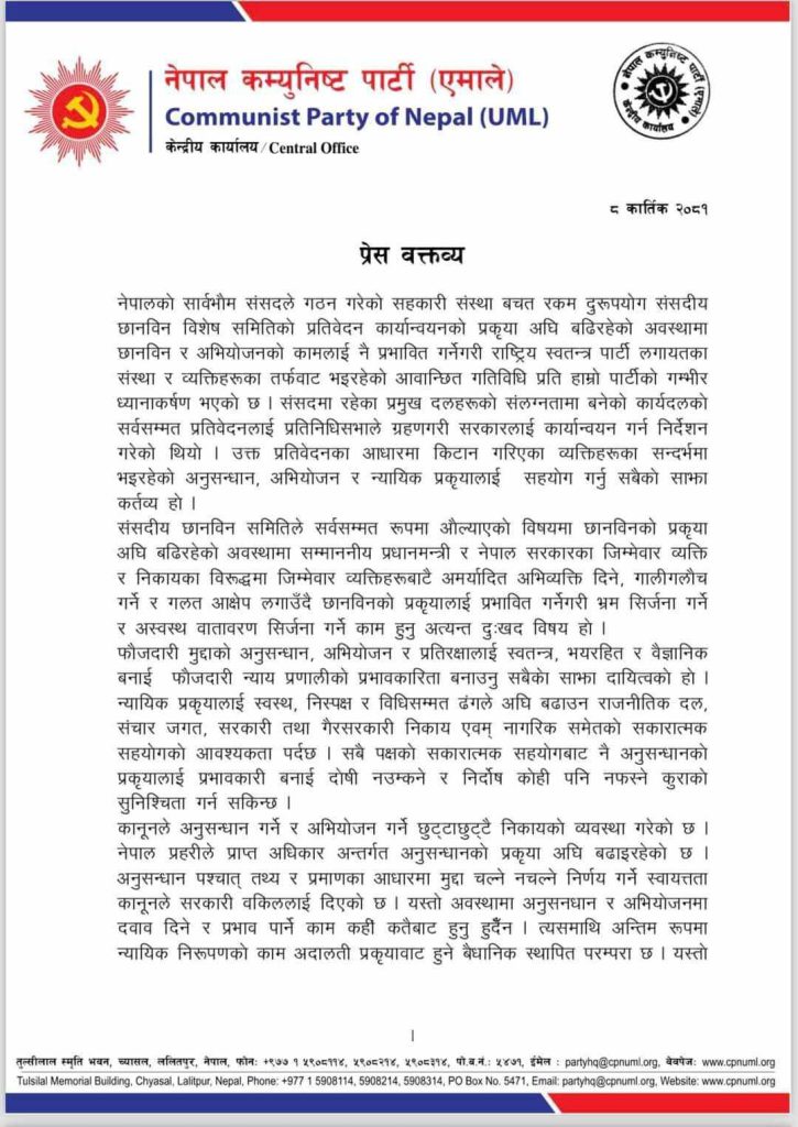 काठमाडौं । नेकपा (एमाले)ले सहकारी संस्थाको बचत रकम ठगी प्रकरणमा संसदीय समितिको प्रतिवेदनानुसार छानबिन गर्दा प्रधानमन्त्री केपी शर्मा ओली र सरकारविरुद्ध गालीगलौच गरिएकामा आपत्ति जनाएको छ ।