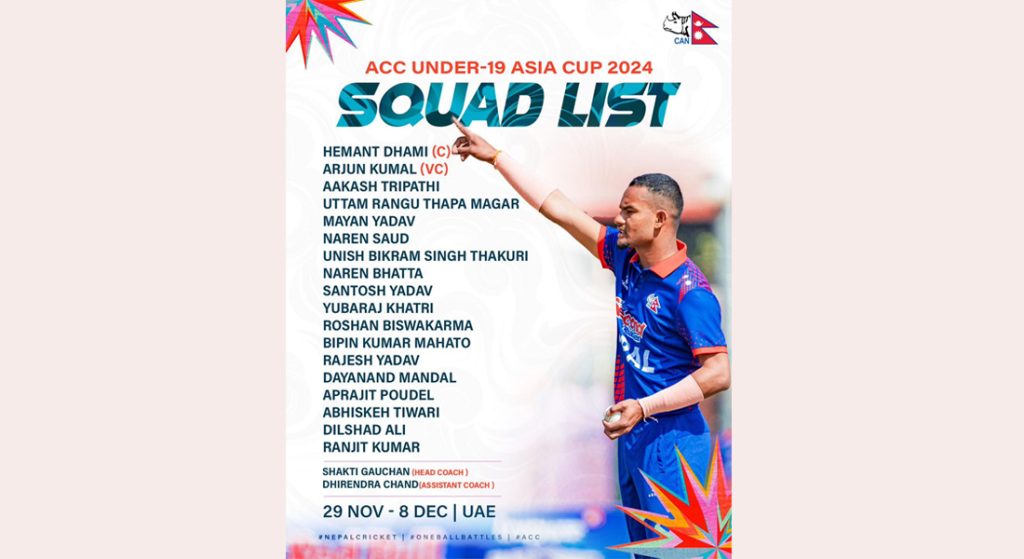 नेपाल क्रिकेट सङ्घ (क्यान)ले शनिबार एसियन क्रिकेट काउन्सिल (एसिसी)को आयोजनामा हुन लागेको यु–१९ एसिया कपको लागि नेपाली टोली घोषणा गरेको हो ।