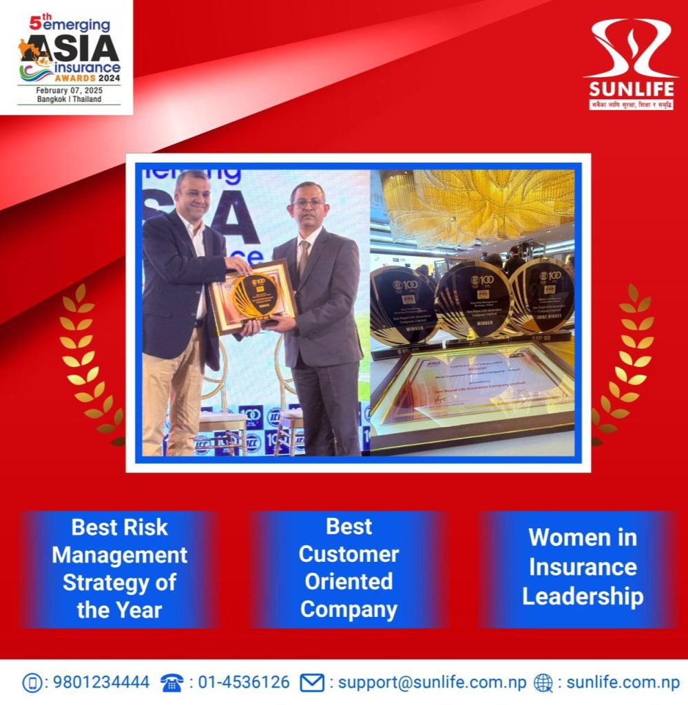 कम्पनीले “उत्कृष्ट जोखिम व्यवस्थापन रणनीति,” “बीमा क्षेत्रमा महिला नेतृत्व,” तथा “उत्कृष्ट ग्राहकमैत्री जीवन बीमा सेवा” विधामा उच्च सम्मान प्राप्त गर्दै आफ्नो व्यवसायिक उत्कृष्टता प्रमाणित गरेको छ।