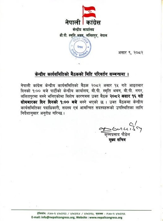 असार १५ गतेका लागि बोलाइएको कांग्रेस केन्द्रीय समिति बैठक असार १६ गतेका लागि सारिएको पार्टी केन्द्रीय कार्यालयका मुख्यसचिव कृष्णप्रसाद पौडेलले विज्ञप्तिमार्फत जानकारी दिएका छन् ।