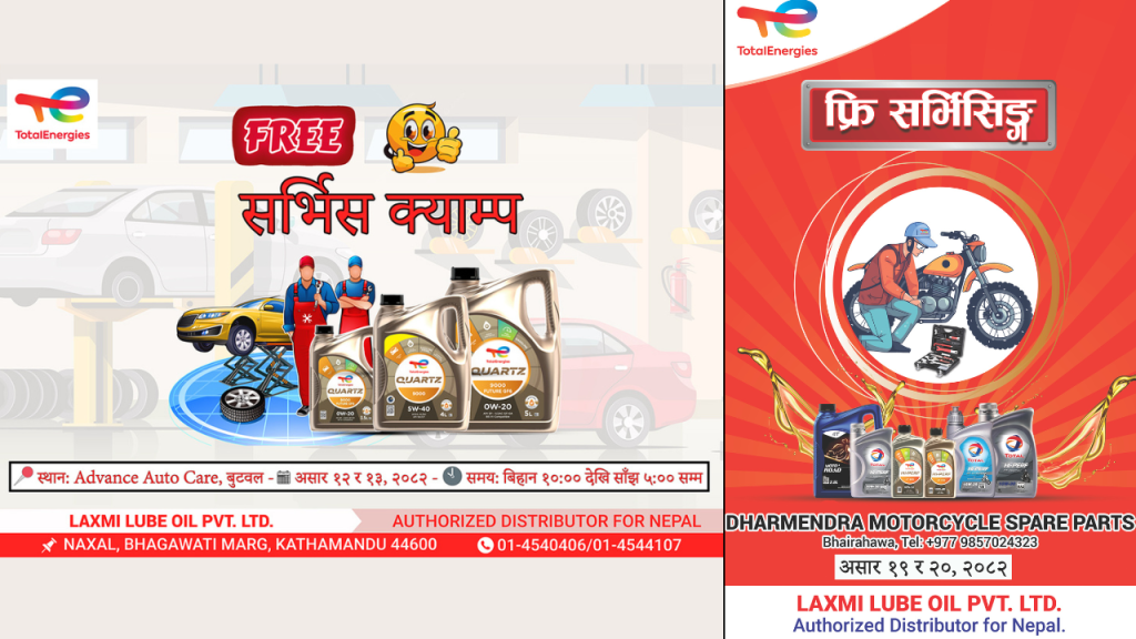 काठमाडौँ । नेपालका लागि विश्व प्रसिद्ध ब्रान्ड टोटल इनर्जीज् लुब्रिकेन्ट्सको आधिकारिक वितरक, लक्ष्मी ल्युब आयल प्रालिले पहिलोपटक काठमाडौँ उपत्यका बाहिर दुईपांग्रे र चारपांग्रे सवारी साधनका लागि छुट्टाछुट्टै फ्रि सर्भिस क्याम्प आयोजना गर्न लागेको छ ।