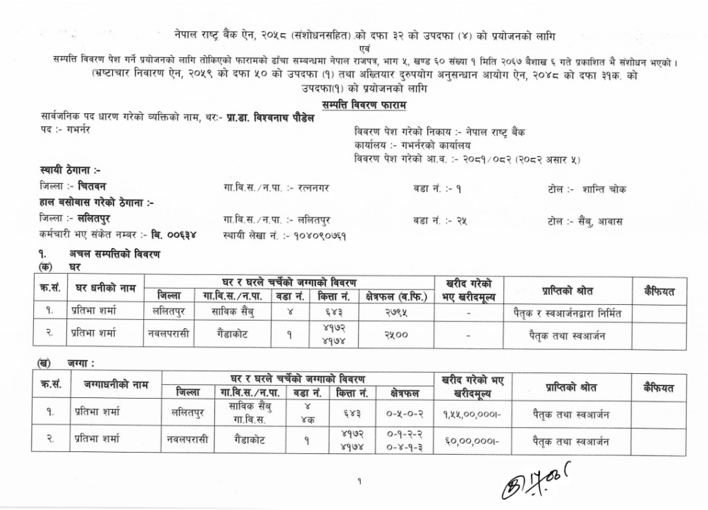 गभर्नर पौडेलको सम्पत्ति : ७ कम्पनीमा १४ करोडको सेयर, ४५ तोला सुन