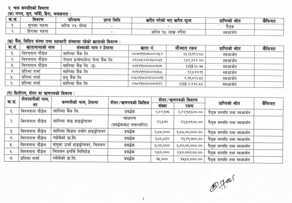पौडेलले श्रीमती प्रतिभा शर्मा र आफ्नो नाममा गरी २० लाखभन्दा बढी विभिन्न बैंकमा बचत रहेको उल्लेख गरेका छन् भने सानिमा बैंकमा डलर खातामा साढे ५ हजार अमेरिकी डलर रहेको पनि उल्लेख गरेका छन् ।