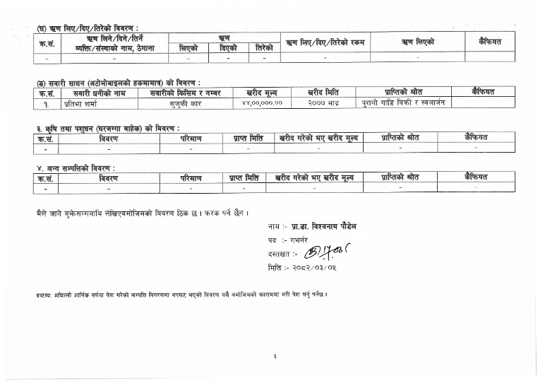 साथै श्रीमती शर्माको नाममा ४४ लाख रुपैयाँ पर्ने सुजुकी कार रहेको उनले खुलाएका छन् । सार्वजनिक पदधारण गरेपछि सम्पत्ति विवरण सार्वजनिक गर्नुपर्ने व्यवस्था छ ।
