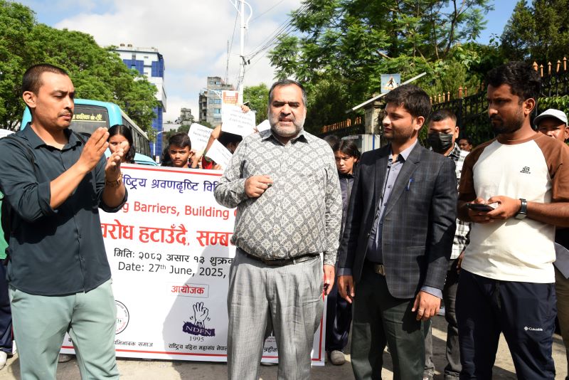 नेपाल नेत्रहीन सङ्घका अध्यक्ष शिशिर खनालले विभिन्न प्रकारका अपाङ्गता भएका व्यक्तिहरूको दिवसका विषयमा जानकारी गराउँदै सन् २०२५ को जुन २७ लाई संयुक्त राष्ट्रसङ्घको महासभाले अन्तरर्राष्ट्रिय दिवसको रुपमा मान्यता दिएर अपाङ्गता भएका व्यक्तिका बारेमा सचेतना फैलाउन थप सहयोग पुग्ने बताउदै शुभकामना व्यक्त गरे ।
