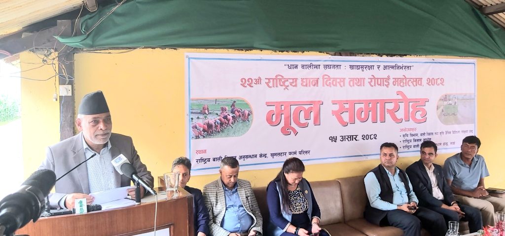 कृषि विभागले आज आयोजना गरेको २२औँ राष्ट्रिय धान दिवस तथा रोपाइँ महोत्सवमा मन्त्री अधिकारीले मुलुकमा दिगो र समृद्ध अर्थतन्त्र निर्माण गर्न कृषि उत्पादन वृद्धि गर्नुपर्ने बताए। कृषिमा आधुनिकीकरण आवश्यक रहेको उल्लेख गर्दै उहाँले कृषि पेसालाई थप व्यवस्थित र मर्यादित बनाउन सरकारले कृषक कल्याणका विविध कार्यक्रम सञ्चालन गर्ने प्रतिबद्धता व्यक्त गरे।