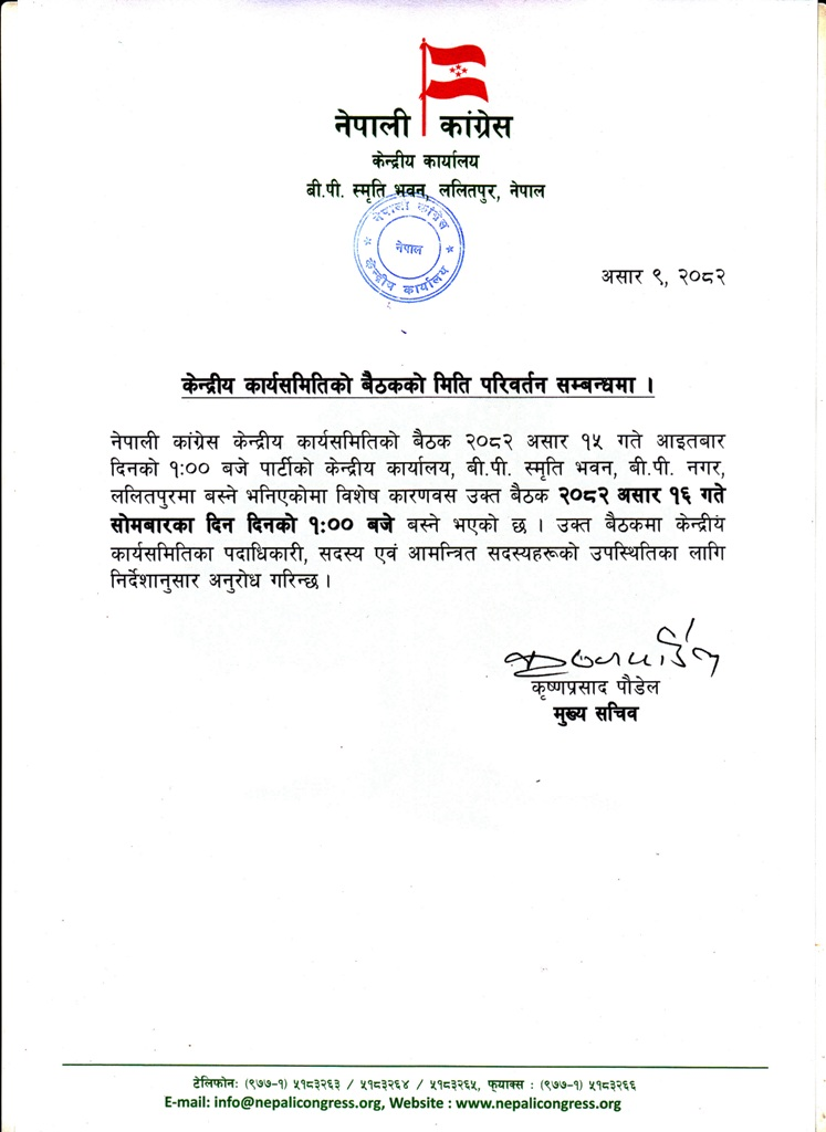 नेपाली कांग्रेसको केन्द्रिय समिति बैठक आजवाट,यस्ता छन् बैठकका एजेन्डा