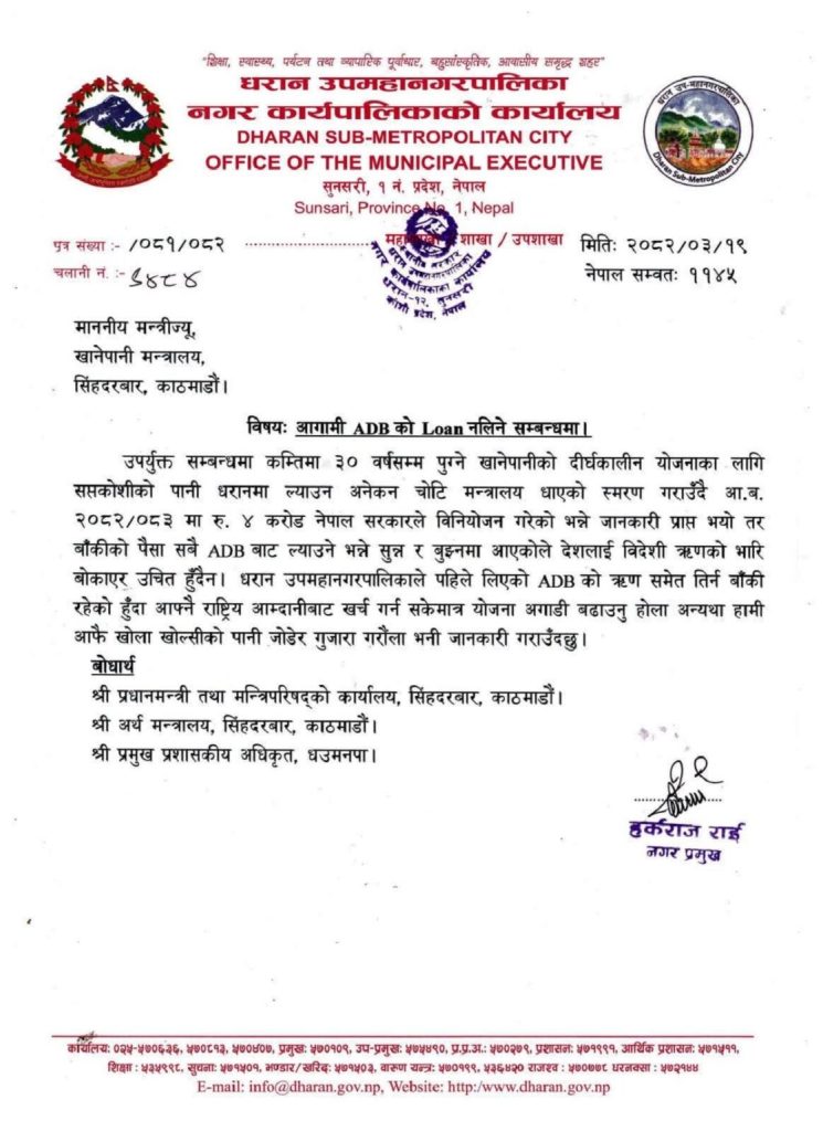 काठमाडौं । धरान उपमहानगरपालिकाका मेयर हर्क साम्पाङ राईले एडीबीको कुनै पनि ऋण नलिने घोषणा गरेका छन् । खानेपानी मन्त्रालयलाई पत्र लेख्दै उनले यस्तो घोषणा गरेका हुन् ।