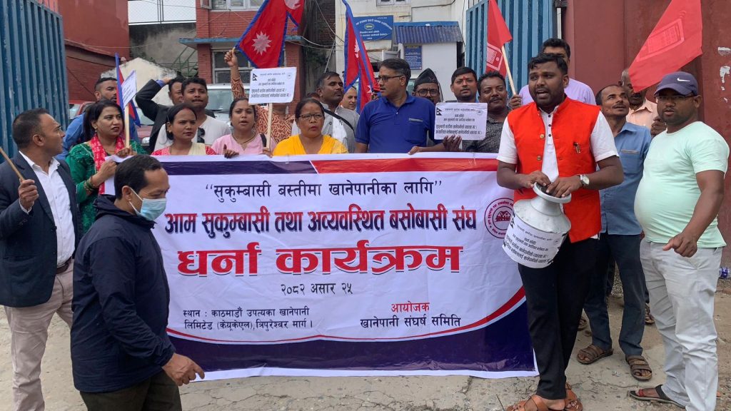 ‘आजको २१औं शताब्दिमा आफ्नै देशका नागरिकलाई खानेपानीको हकबाट वञ्चित गर्ने मानवता विरोधी कार्य विरुद्ध हामी काठमाडौं उपत्यका खानेपानी लिमिटेडमा धर्ना तथा विरोधको कार्यक्रम गर्न बाध्य भएका छौं । हामी हाम्रो मागको बारेमा सरकार र सम्बन्धित निकायलाई पटक पटक ध्यानाकर्षण गराउँदा समेत कुनै सुनुवाई नभएपछि कार्यालय घेराउ गर्नु परेको हो,’ सुकुम्बासी संघका अध्यक्ष विकले भने ।