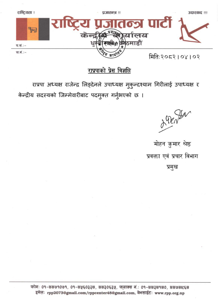 पार्टी अध्यक्ष राजेन्द्र लिङ्देनले उनलाई उपाध्यक्ष र केन्द्रीय सदस्यको जिम्मेवारीबाट पदमुक्त गरेको प्रचार विभाग प्रमुख एवं प्रवक्ता मोहनकुमार श्रेष्ठले जानकारी दिए ।