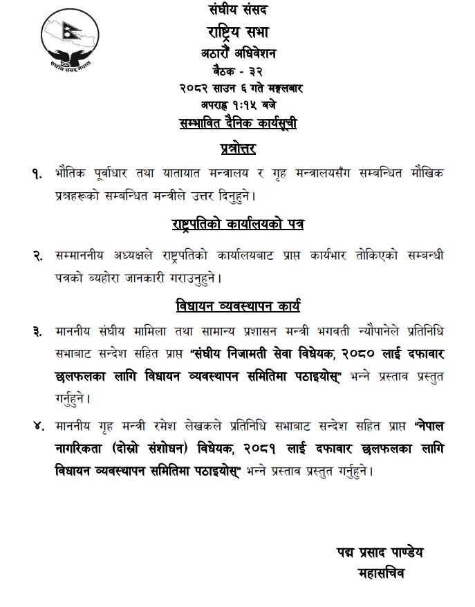बैठकमा सङ्घीय मामिला तथा सामान्य प्रशासनमन्त्री भगवती न्यौपानेले प्रतिनिधिसभाबाट सन्देशसहित प्राप्त ‘सङ्घीय निजामती सेवा विधेयक, २०८० लाई दफावार छलफलका लागि विधायन व्यवस्थापन समितिमा पठाइयोस्’ भन्ने प्रस्ताव प्रस्तुत गर्ने सम्भावित कार्यसूची रहेको छ ।यस्तै, गृहमन्त्री रमेश लेखकले प्रतिनिधिसभाबाट सन्देशसहित प्राप्त ‘नेपाल नागरिकता (दोस्रो संशोधन) विधेयक, २०८१ लाई दफावार छलफलका लागि विधायन व्यवस्थापन समितिमा पठाइयोस्’ भन्ने प्रस्ताव प्रस्तुत गर्ने छन् ।