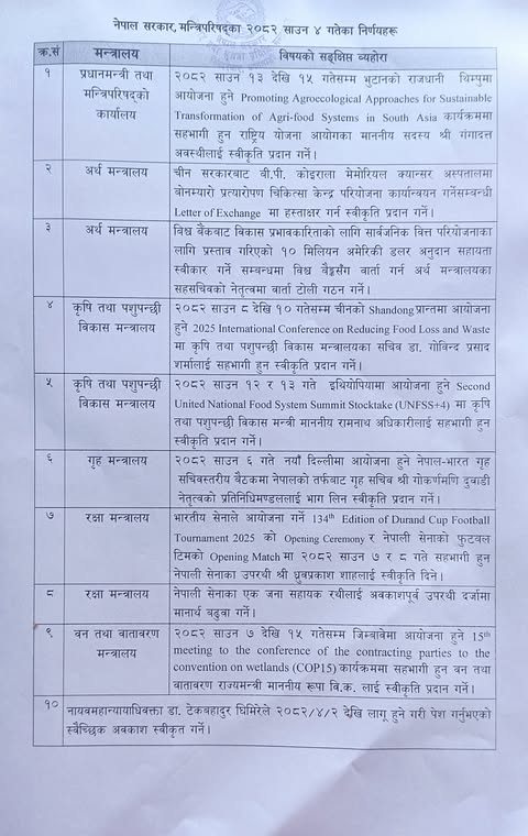 काठमाडौँ । साउन ४ गते बसेको मन्त्रिपरिषद् बैठकका १० निर्णय सार्वजनिक भएका छन् ।