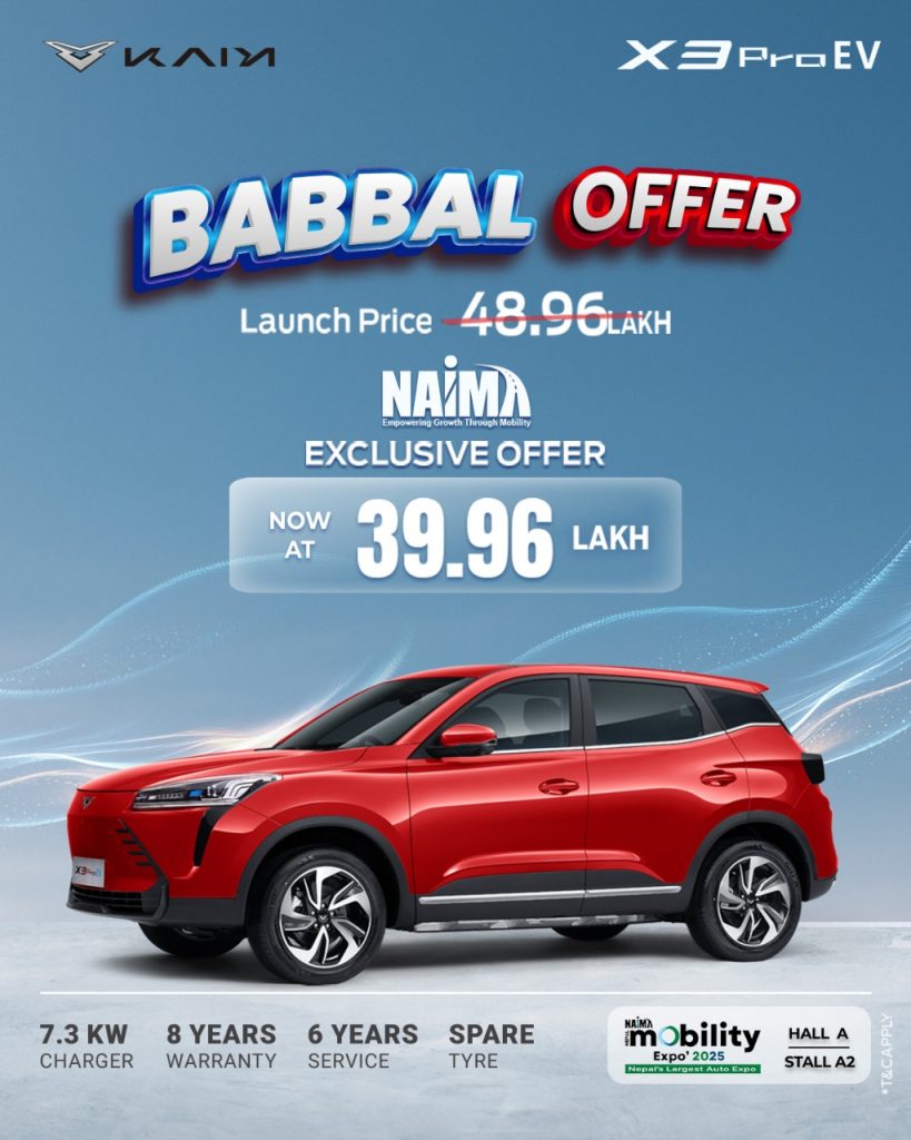 यो विशेष मूल्य नाईमा नेपाल मोबिलिटी एक्स्पो २०२५ को समयमा मात्र सीमित अवधिका लागि उपलब्ध छ। काठमाण्डौको भृकुटीमण्डपस्थित हल ए मा रहेको केयीको स्टल नम्बर ए२ (तपाईं प्रवेश गर्ने बित्तिकै दायाँपट्टिको पहिलो स्टल) मा गएर एक्स थ्री प्रो ईभी को अनुभव लिन सकिन्छ ।