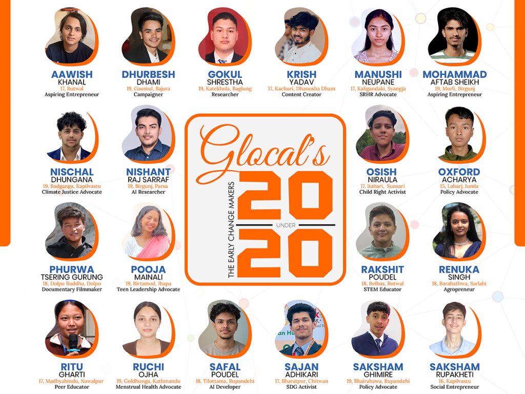 ग्लोकल २० अन्डर २०, २०२५ का लागि छानिएका आवेदकहरू मध्ये बुटवलका आविश खनाल, बाजुराका ध्रुबेश धामी, बाग्लुङका गोकुल श्रेष्ठ, धनुषाका कृष यादव, स्याङ्जाकी मानुषी न्यौपाने, वीरगन्जका मोहम्मद अफताब शेख, कपिलवस्तुका निश्चल ढुंगाना, पर्साका निशान्त राज सर्राफ, सुनसरीका ओसिस निराला, जुम्लाका अक्सफोर्ड आचार्य, डोल्पाका फुर्वा छिरिङ गुरुङ, झापाकी पूजा मैनाली, बुटवलका रक्षित पौडेल रहेका छन् । त्यसैगरी, सर्लाहीबाट रेणुका सिंह, नवलपुरबाट ऋतु घर्ती, काठमाडौंबाट रुचि ओझा, रुपन्देहीबाट सफल पौडेल र सक्षम घिमिरे, चितवनबाट सजन अधिकारी, कपिलवस्तुबाट सक्षम रुपाखेती छनौटमा परेका छन् ।