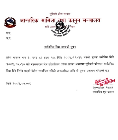 काठमाडौँ । हरितालिका तीज पर्वको अवसर पारेर लुम्बिनी प्रदेश सरकारले भोली सार्वजनिक बिदा दिने निर्णय गरेको छ ।