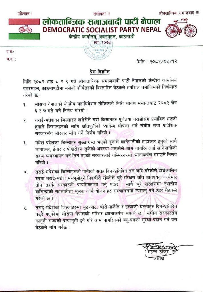 काठमाडौं। लोकतान्त्रिक समाजवादी पार्टी नेपालको महाधिवेसन यसै बर्षको अन्त्यमा हुने भएको छ।