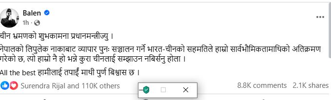 उनले लेखेका छन्– ‘चीन भ्रमणको शुभकामना प्रधानमन्त्रीज्यू । नेपालको लिपुलेक नाकाबाट व्यापार पुनः सञ्चालन गर्ने भारत–चीनको सहमतिले हाम्रो सार्वभौमिकता माथिको अतिक्रमण गरेको छ, त्यो हाम्रो नै हो भन्ने कुरा चीनलाई सम्झाउन नबिर्सनु होला ।’केही समयअघि नेपाललाई थाहा नदिई भारत र चीनले लिपुलेक त्रिदेशीय नाकाबाट पुन: व्यापार सञ्चालन गर्ने सहमति गरेका थिए । त्यसपछि पुन: लिपुलेकको विषय चर्चामा आएको हो ।
