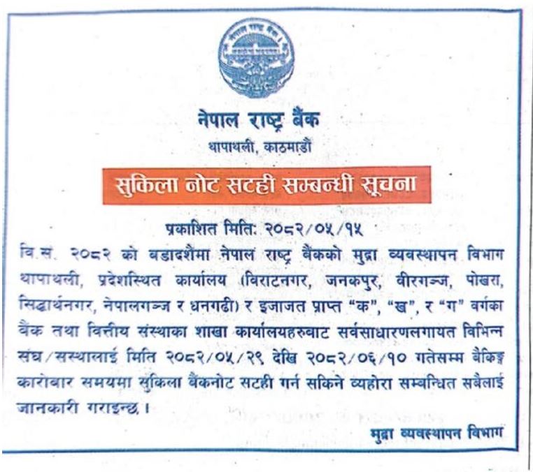 राष्ट्र बैंकले आज आइतबार सूचना जारी गर्दै यस्तो जानकारी सार्बजनिक गरेको हो । सुचना अनुसार राष्ट्र बैंकको मुद्रा व्यववस्थापन विभाग थापाथली, विराटनगर, जनकपुर, वीरगञ्ज, पोखरा, सिद्धार्थनगर, नेपालगञ्ज र धनगढीस्थित प्रादेशिक कार्यालयमा सुकिला नोट सटही सुविधा उपलब्ध हुनेछ।