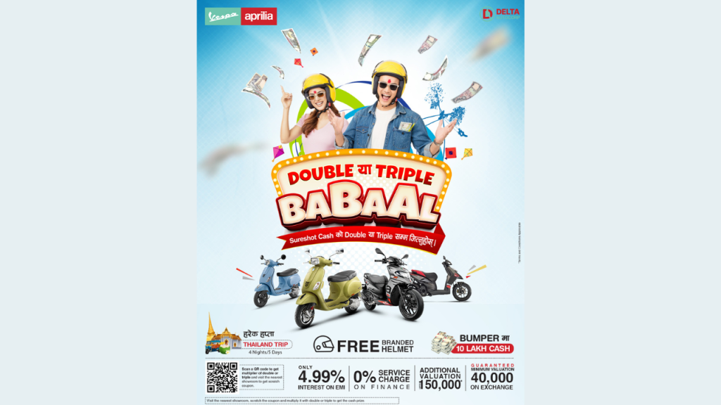 काठमाडौं । नेपालका लागि भेस्पा एप्रिलिया स्कुटरका आधिकारिक वितरक डेल्टा अटोकर्प प्रालिले दसैँ, तिहार तथा छठ पर्वको अवसरमा ‘डबल या तेब्बर बबाल’ फेस्टिभ अफर सार्वजनिक गरेको छ ।