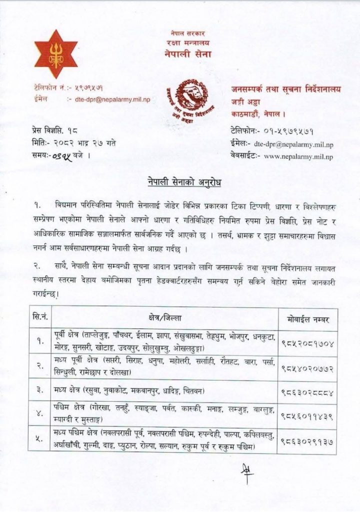विहीबार साँझदेखि रातिसम्म सामाजिक सञ्जालमा सेनाको सक्रियताबारे अनेकौं हल्लाहरू फैलिएका थिए । त्यसैको प्रतिवाद गर्दै सेनाले सूचना आदानप्रदान गर्न पृतना हेडक्वार्टरहरूसँग समन्वय गर्न भन्दै सम्पर्क नम्बरहरू सार्वजनिक गरेको छ ।