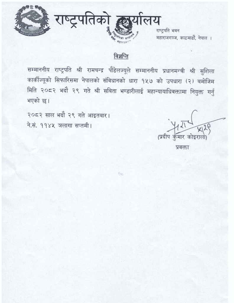 पहिलो महिला महान्यायाधिवक्तामा सविता भण्डारी नियुक्त