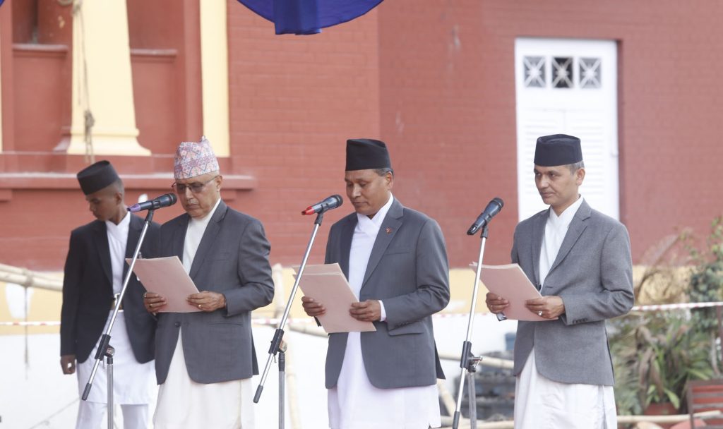 नवनियुक्त अर्थमन्त्री रामेश्वरप्रसाद खनाल, ऊर्जा, जलस्रोत तथा सिँचाइ, भौतिक पूर्वाधार र सहरी विकासमन्त्री कुलमान घिसिङ र गृह तथा कानुनमन्त्री ओमप्रकाश अर्यालले प्रधानमन्त्री सुशीला कार्कीको उपस्थितिमा राष्ट्रपति रामचन्द्र पौडेलबाट शपथ लिएका हुन् ।