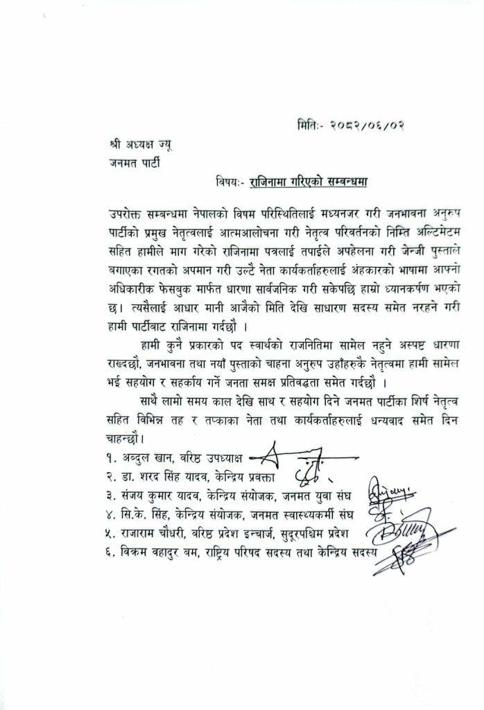 जनमत पार्टीका ६ नेताले दिए सामूहिक राजीनामा