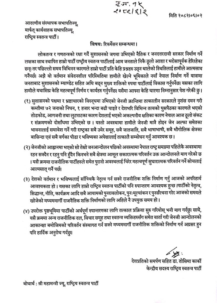 ‘लोकतन्त्र र गणतन्त्रको रक्षा गर्दै सुशासनको जगमा उभिएको नैतिक र जनदत्तरदायी सरकार निर्माण गर्ने लक्षका साथ स्थापित हाम्रो पार्टी राष्ट्रीय स्वतन्त्र पार्टीलाई आम जनताले निकै ठूलो आशा र भरोसापूर्वक हेरिरहेका छन्। तर पछिल्लो समय विभिन्न कारणले हाम्रो पार्टीप्रति केही प्रश्नहरू उठ्न थालेको स्थितिलाई हामीले आत्मसात गर्नैपर्छ। अझै यो वर्तमान संवेदनशील परिस्थितिमा हामीले खेल्ने भूमिकाले नयाँ नेपाल निर्माण गर्ने यात्रामा जनताबाट सुशासनको म्याण्डेटसहित अघि बढ्न मुख्य शक्तिको रुपमा पार्टीलाई विकास गर्नुपर्नेछ। यसका लागि हामीले यथाशीघ्र केही महत्त्वपूर्ण निर्णय र कार्यहरू गर्नुपर्नेछ। यसैमा आफ्ना केही धारणा निम्नानुसार पेस गरेकी छु,’ उनले प्रस्ताव अघि सार्दै भनेकी छन्।